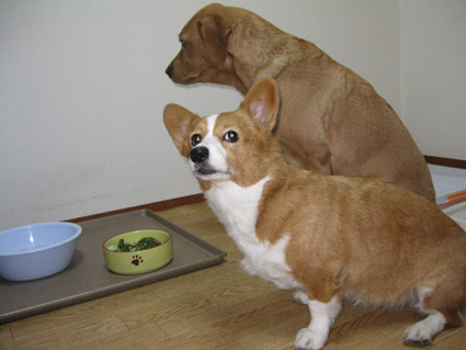 写真はまだ1月程前の物。ご飯を前に「良し」の合図を待っている2匹。