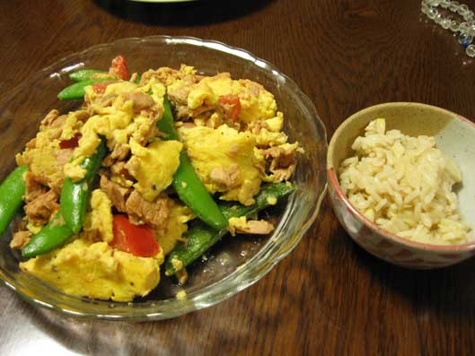 簡単だけど、意外と美味しい、トマトとツナとエンドウの卵炒め。と、これまた大好物のタケノコご飯。